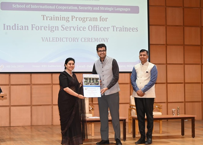 ગુજરાત, ભારત સરકારના ગૃહ મંત્રાલય હેઠળની રાષ્ટ્રીય મહત્વની સંસ્થા, રાષ્ટ્રીય રક્ષા યુનિવર્સિટી (RRU), એ સ્કૂલ ઓફ ઇન્ટરનેશનલ કોઓપરેશન, સિક્યુરિટી એન્ડ સ્ટ્રેટેજિક લેંગ્વેજીસ (SICSSL) દ્વારા આયોજિત ભારતીય વિદેશ સેવા અધિકારી તાલીમાર્થીઓ માટે ગતિશીલ અને બૌદ્ધિક રીતે નિમજ્જન તાલીમ કાર્યક્રમ સફળતાપૂર્વક પૂર્ણ કર્યો. આ કાર્યક્રમ યુવા રાજદ્વારીઓને વિદેશ નીતિ, રાષ્ટ્રીય સુરક્ષા અને વૈશ્વિક શાસનમાં અત્યાધુનિક વ્યૂહાત્મક દ્રષ્ટિકોણ અને આંતર-શિસ્ત આંતરદૃષ્ટિથી સજ્જ કરવા માટે ડિઝાઇન કરવામાં આવ્યો હતો.
