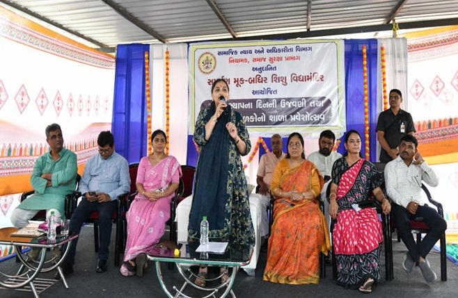 “સૌ ભણે, સૌ આગળ વધે”ના સંકલ્પથી શરૂ કરાયેલા શાળા પ્રવેશોત્સવ અંતર્ગત ગાંધીનગરના સમર્પણ મૂક બધિર શિશુ વિદ્યામંદિર ખાતેથી વિવિધ પાંચ દિવ્યાંગ શાળાના ૩૪ બાળકોને સામાજિક ન્યાય અને અધિકારીતા મંત્રી શ્રી ભાનુબેન બાબરીયાએ શાળામાં પ્રવેશ કરાવીને તેમના ભણતરની શરૂઆત કરાવી હતી.