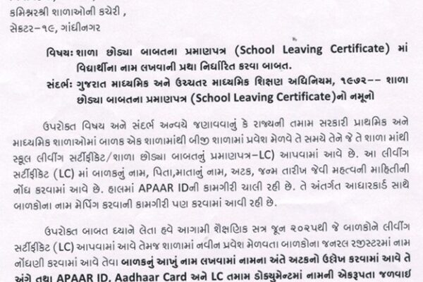 ગાંધીનગર, ગુજરાતની તમામ સરકારી પ્રાથમિક અને માધ્યમિક શાળાના વિદ્યાર્થીઓને જૂન 2025થી શાળા છોડ્યાનું પ્રમાણપત્ર (LC) આપતી વખતે હવેથી અટક પાછળ…