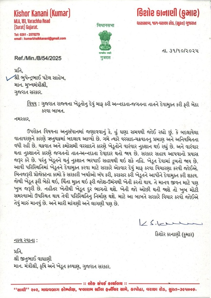 બદલાતા વાતાવરણ અને વારંવાર આવતી કુદરતી આફતોને કારણે ગુજરાતના ખેડૂતો વારંવાર પાકના નુકસાનનો સામનો કરી રહ્યા છે, જેના કારણે તેઓ દેવાની જાળમાં ફસાઈ પડ્યા છે. આ સમસ્યા હલ કરવા વરાછા વિધાનસભા બેઠકના ભાજપ ધારાસભ્ય કુમારભાઈ કાનાણીએ મુખ્યમંત્રી અને કૃષિ મંત્રીને પત્ર લખીને ખેડૂતોના દેવા માફ કરવાની માંગ કરી છે. પત્રમાં તેમણે જણાવ્યું છે કે સરકારે આગળ આવીને ખેડૂતોને દેવા મુક્ત કરીને તેમને ફરી બેઠા કરવા જોઈએ, જેથી તેઓ ચિંતા મુક્ત થઈને ખેતી તરફ પરત ફરે.