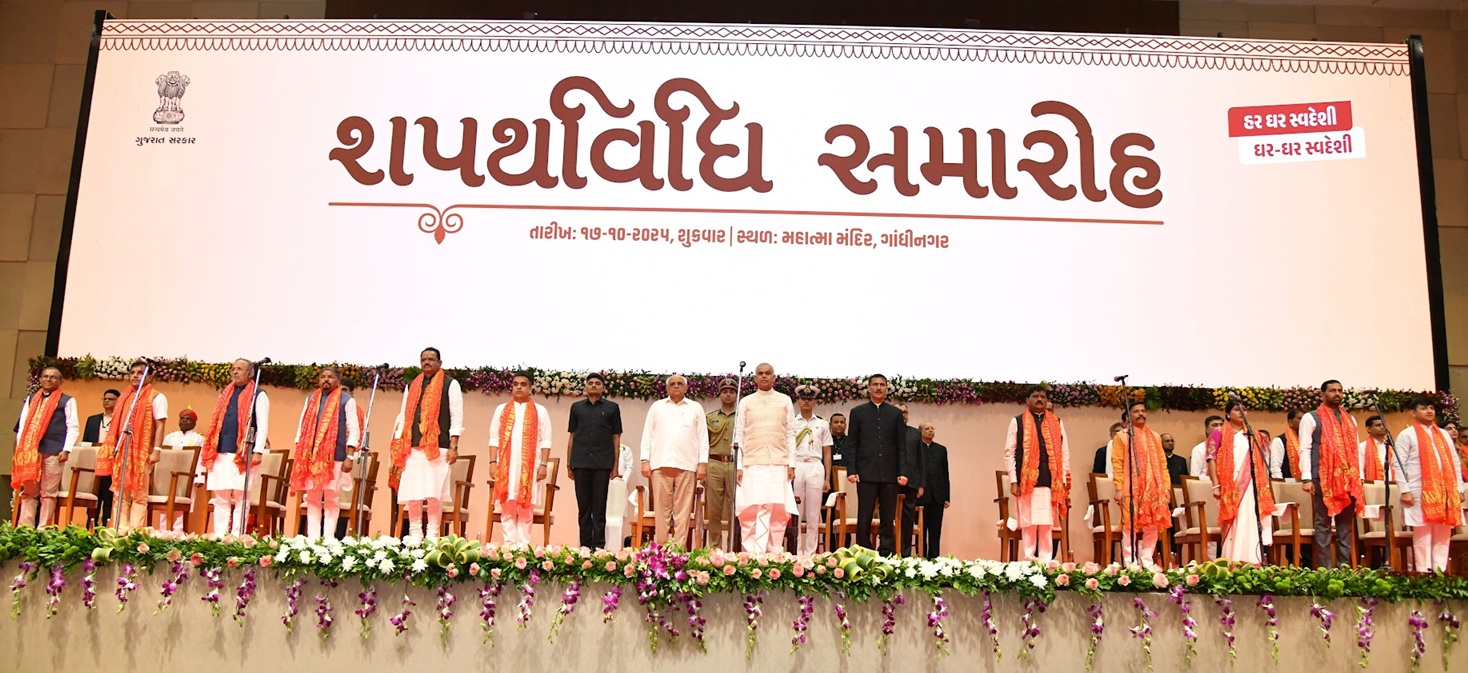 જ્યારે રાજ્યકક્ષાના મંત્રી તરીકે શ્રી કાંતિલાલ અમૃતિયા, શ્રી રમેશભાઈ કટારા, શ્રીમતી દર્શનાબહેન વાઘેલા, શ્રી કૌશીકભાઈ વેકરીયા, શ્રી પ્રવિણકુમાર માળી, ડૉ. જયરામભાઈ ગામીત, શ્રી ત્રિકમભાઈ છાંગા, શ્રી કમલેશભાઈ પટેલ, શ્રી સંજયસિંહ મહિડા, શ્રી પી.સી. બરંડા, શ્રી સ્વરૂપજી ઠાકોર અને શ્રીમતી રિવાબા જાડેજાએ રાજ્યપાલશ્રી સન્મુખ શપથ ગ્રહણ કર્યા હતાં.