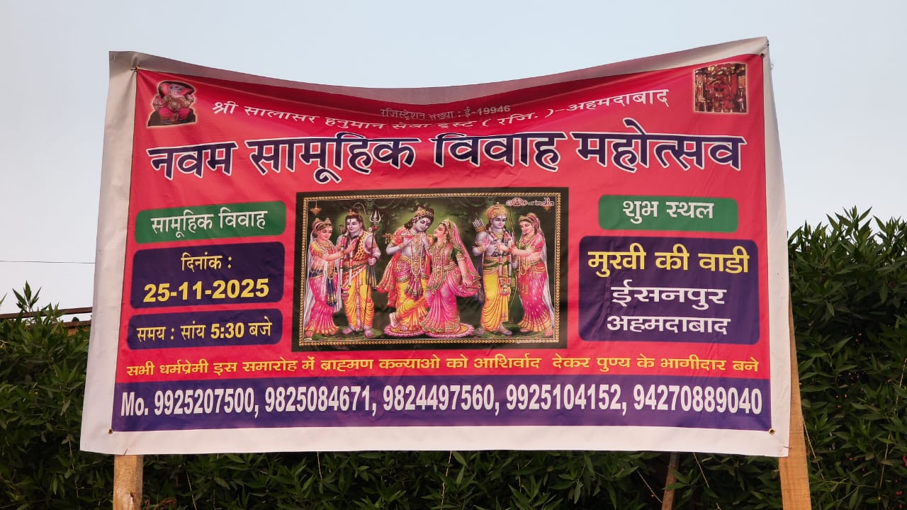 અમદાવાદ, ઈસનપુર | શ્રી સાલાસર હનુમાનજી સેવા ટ્રસ્ટ દ્વારા દર વર્ષની પરંપરા અનુસાર આ વર્ષે પણ 7 જરૂરતમંદ બ્રાહ્મણ કન્યાઓના સામૂહિક લગ્ન સમારોહનું ભવ્ય આયોજન મંગળવાર, 25 નવેમ્બર 2025ના રોજ મુખીની વાડી ખાતે કરવામાં આવ્યું. હનુમાનજીની અપાર કૃપા અને સમાજજનોના સહકાર સાથે કાર્યક્રમ ગૌરવપૂર્ણ રીતે પૂર્ણ થયો.