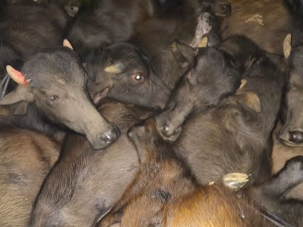 અને હલનચલન ન કરી શકે તે રીતે એકબીજા સાથે ખીચોખીચ ભરેલા મળી આવ્યા હતા. કુલ 23 પાડાઓ હતા,જેમાંથી 2 પાડા